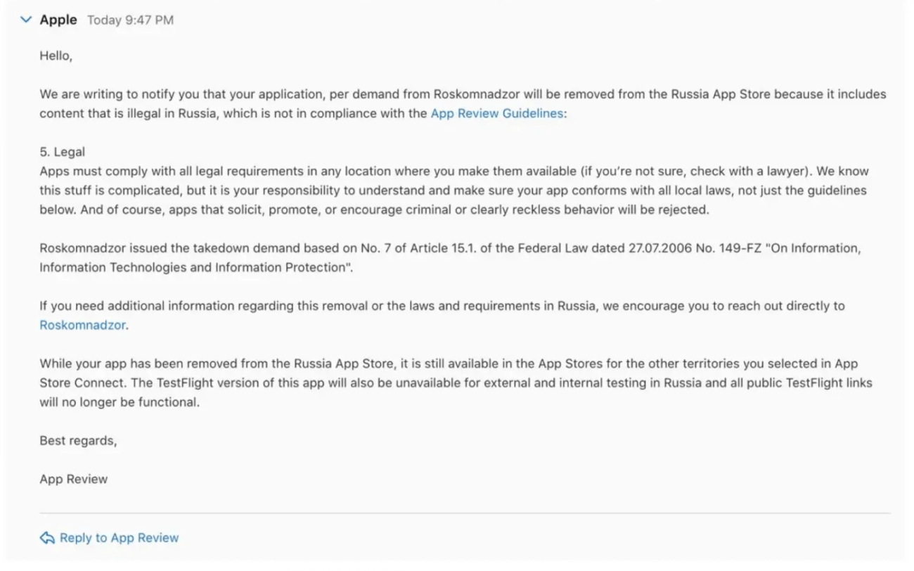 Один из разработчиков показал скриншот письма, в котором компания объясняет решение требованием Роскомнадзора.